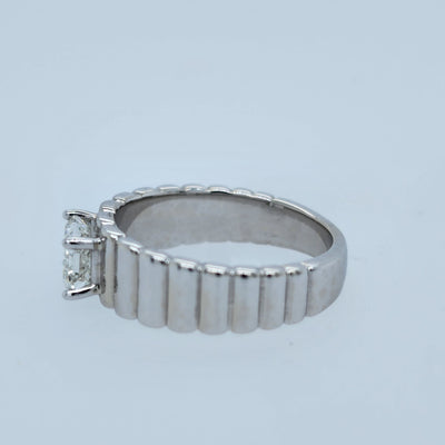 This solitaire engagement ring features a classic and elegant emerald cut diamond set in lustrous white gold. The unique East/West setting adds a modern twist to this timeless design. Make a statement of love with this stunning ring.